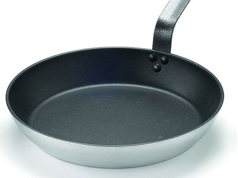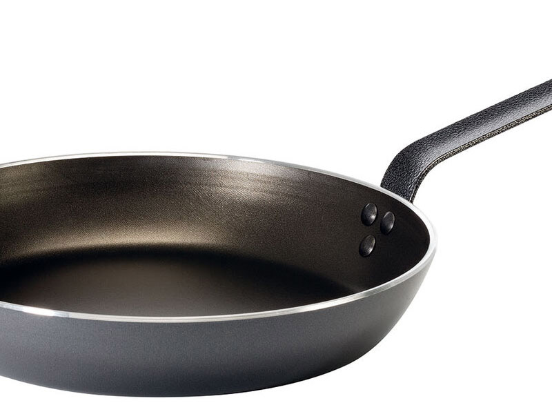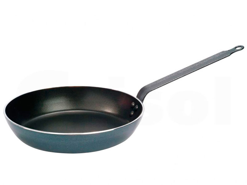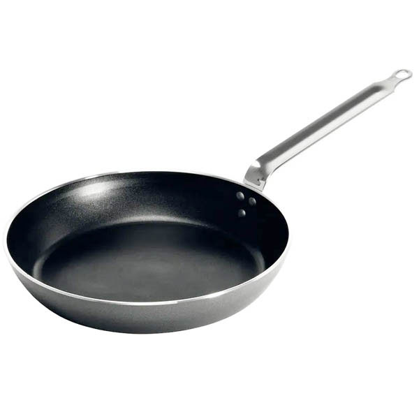 Sartén Classe Chef. Aluminio grueso con revestimiento de 4 capas cruzadas para un uso intensivo (cuerpo de aluminio espeso: de 3 a 5 mm), sin PFAO. Mango remachado de acero, revestimiento Epoxi. Resistente a 150 °C. No apto para lavavajillas. Fondo rayado.