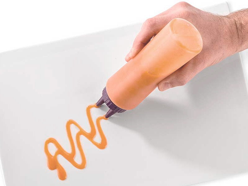 Dispensador a presión fabricado con polietileno de gran resistencia. Diseñado para evitar goteos, asegurando una aplicación limpia y precisa de salsas, mayonesas o aderezos. Ideal para tareas de decoración culinaria. Su envase transparente facilita la identificación rápida del contenido.