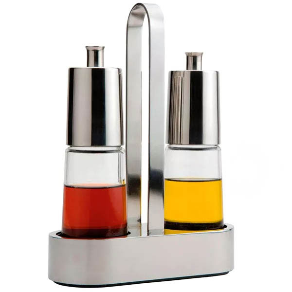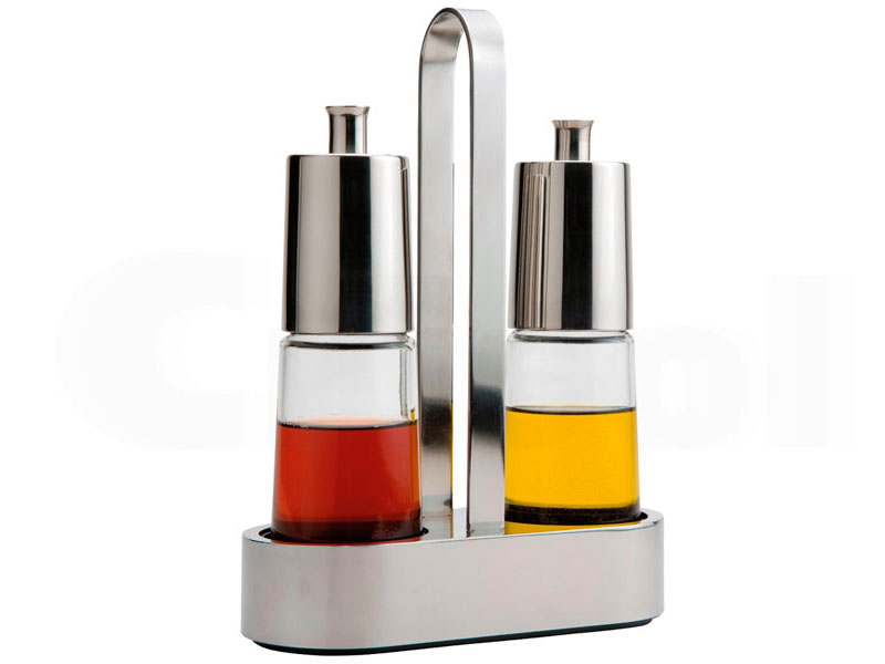 Vinagrera cristal, tapones y soporte en acero inox 18/10. Sistema Antigoteo.