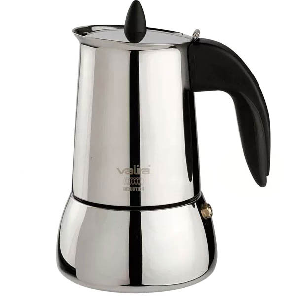 Cafetera Isabella. Acero inoxidable. Máxima resistencia al desgaste. Apta para todas las fuentes de calor, incluido inducción. Asa ergonómico de baquelita para agarre fácil y seguro. Diseño moderno con acabado pulido en espejo.