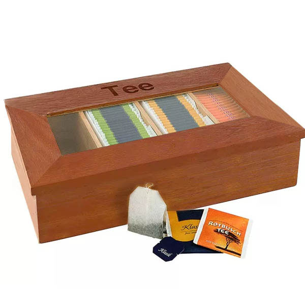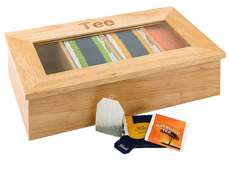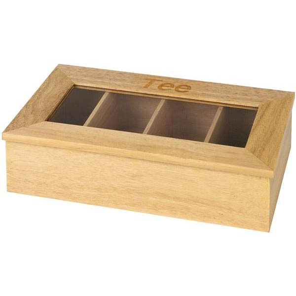 Caja para té y condimentos con ventana transparente. 4 compartimentos. Hasta 120 bolsitas. 2 versiones: madea clara u oscura.