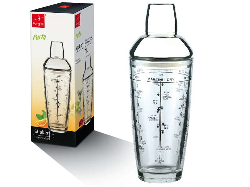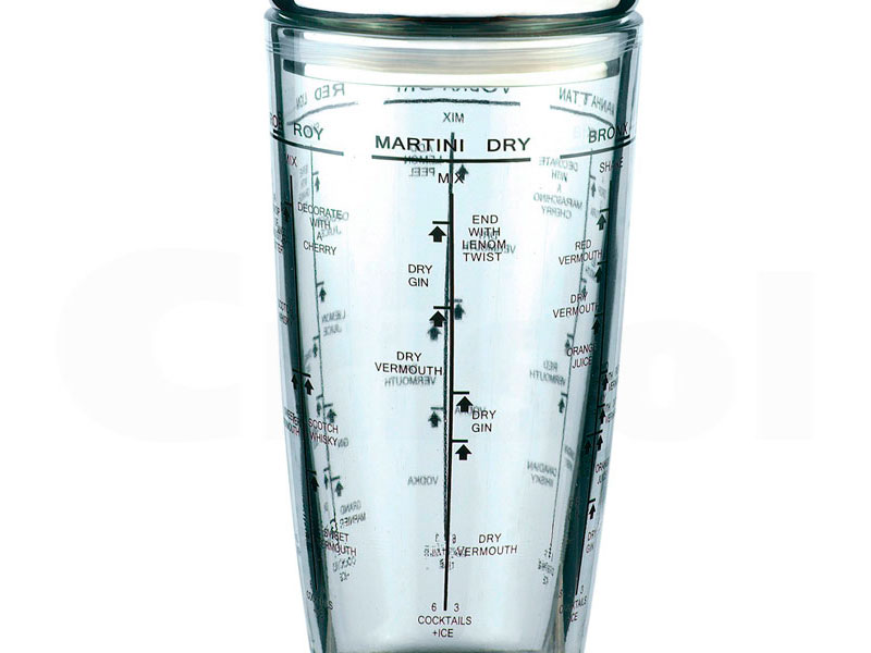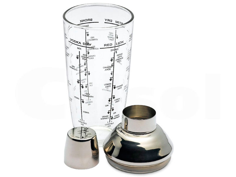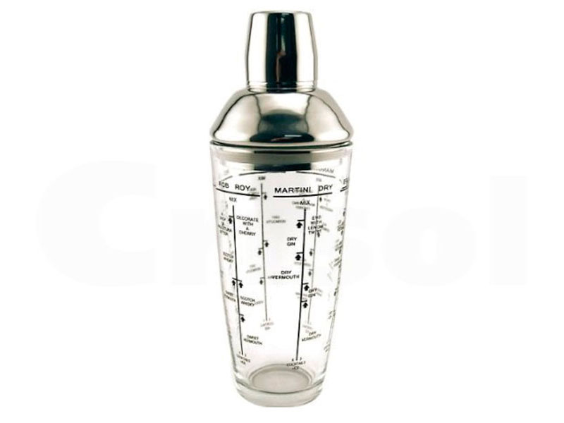 Coctelera de vidrio con tapón en acero inox. Graduada para distintos cocktails.