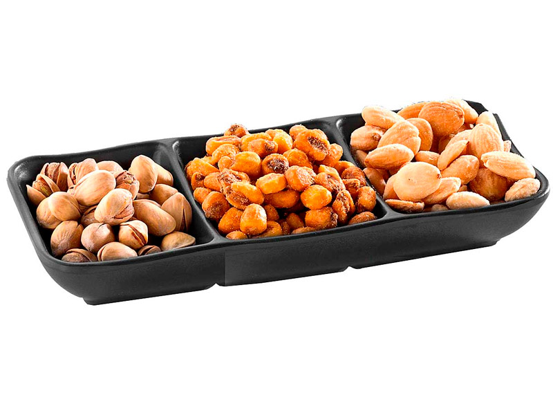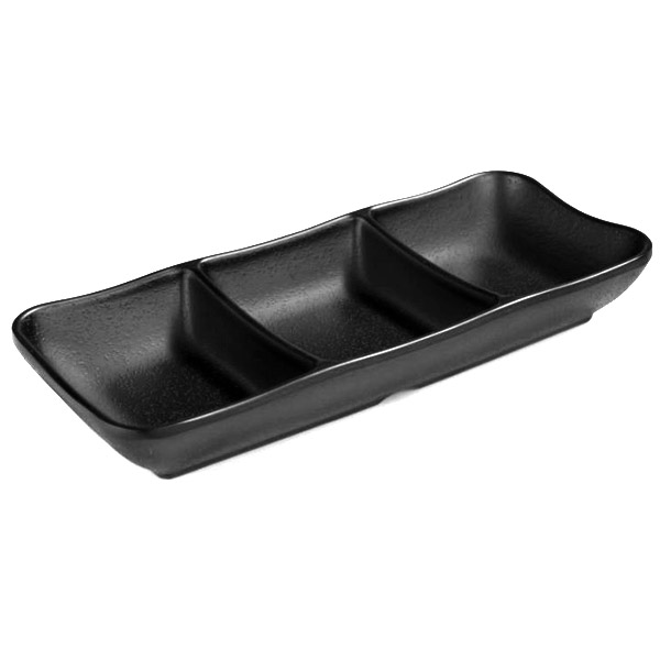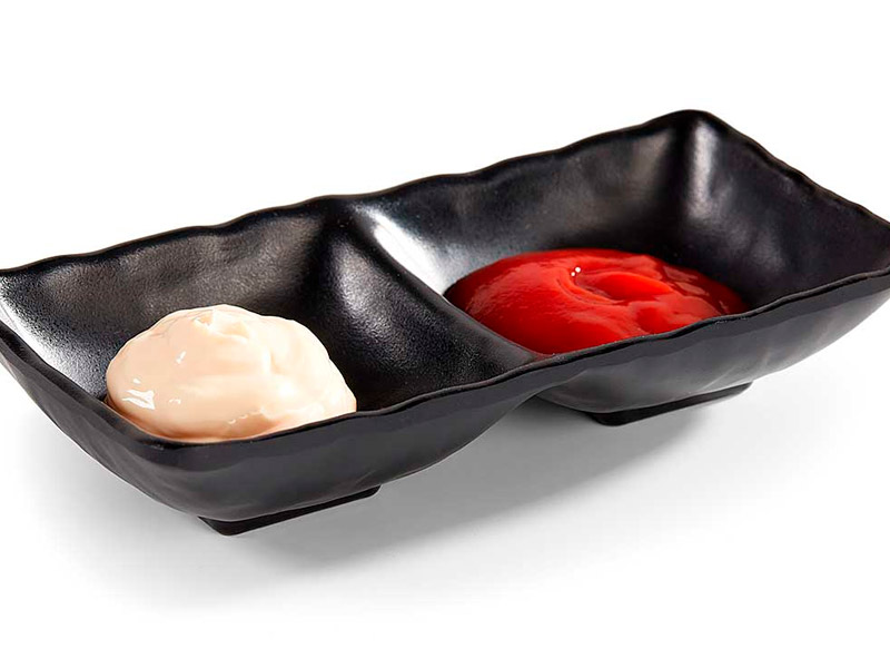 Bandeja de snacks o salsas con 1, 2 o 3 compartimentos fabricada en melamina, para servicio individual. Resistencia al calor y a la corrosión, asegurando una larga vida útil incluso bajo uso frecuente.