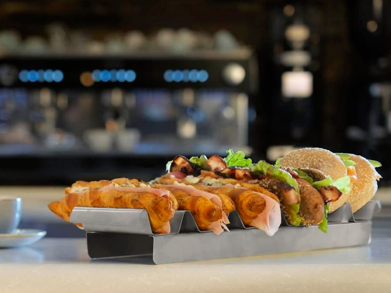 Soporte para bocadillos. Bandeja fabricada en acero inoxidable para hasta 7 bocadillos. Práctico, cómodo y fácil de limpiar.