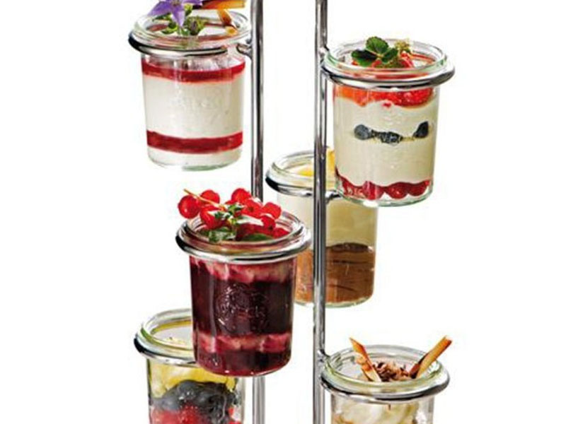 Presentador metálico. Para tarritos de vidrio rectos con tapa Weck (no incluidos) de Ø6 cm. Tamaño expositor Ø22 cm, altura 59 cm. Capacidad 12 tarros.