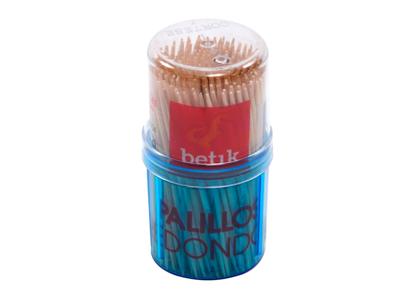 Palillero redondo de plástico. Capacidad para 130 palillos de madera de dos puntas de chopo canadiense. Palillos compostables, degradables y reciclables.