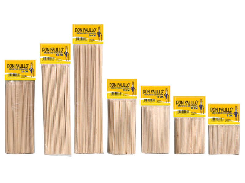 Pinchos para brochetas redondos. Una punta. Largos de 8 a 30 cm. Packs de 100 o 200 unidades.