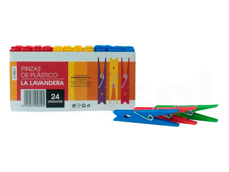 Pinzas La Lavandera con envase retractilado. Pinzas Trébol de plástico bimaterial y en bolsa de plástico.