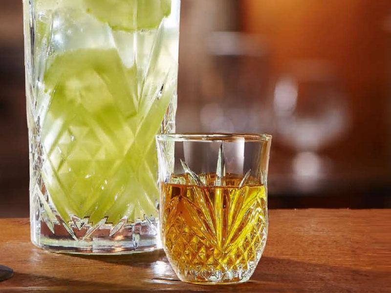 Llamativos efecto de luz en el cristal tallado que añaden una elegante sofisticación al servicio de bebidas con un toque vintage.