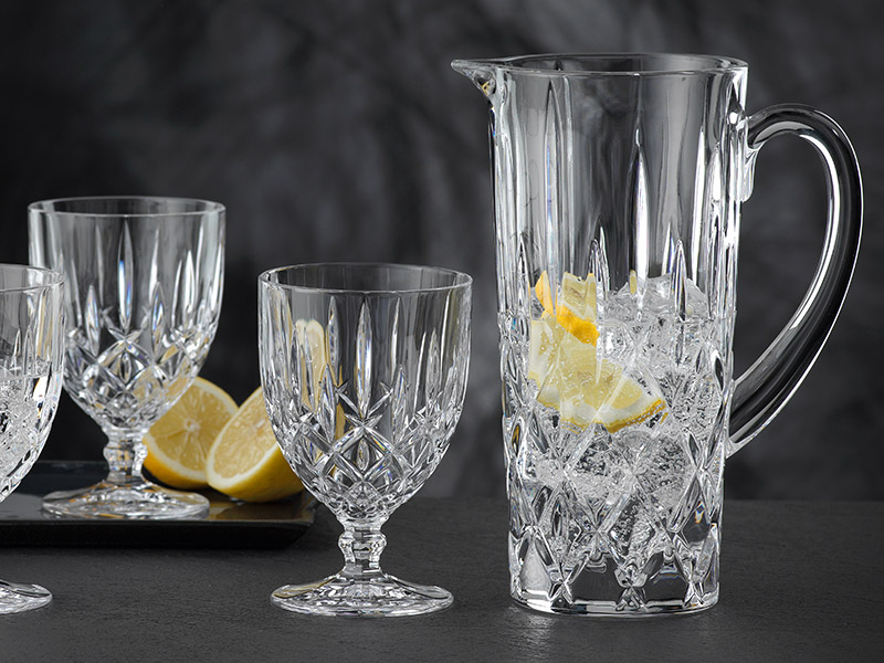 Los llamativos efectos de cristal tallado añaden una elegante sofisticación al servicio de bebidas con un toque vintage.