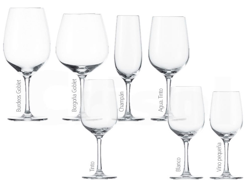 Serie de copas Mencia de 58cl, 44cl, 31cl, 25cl y flauta de 17cl tensionadas de la marca Hostelvia de Vicrila