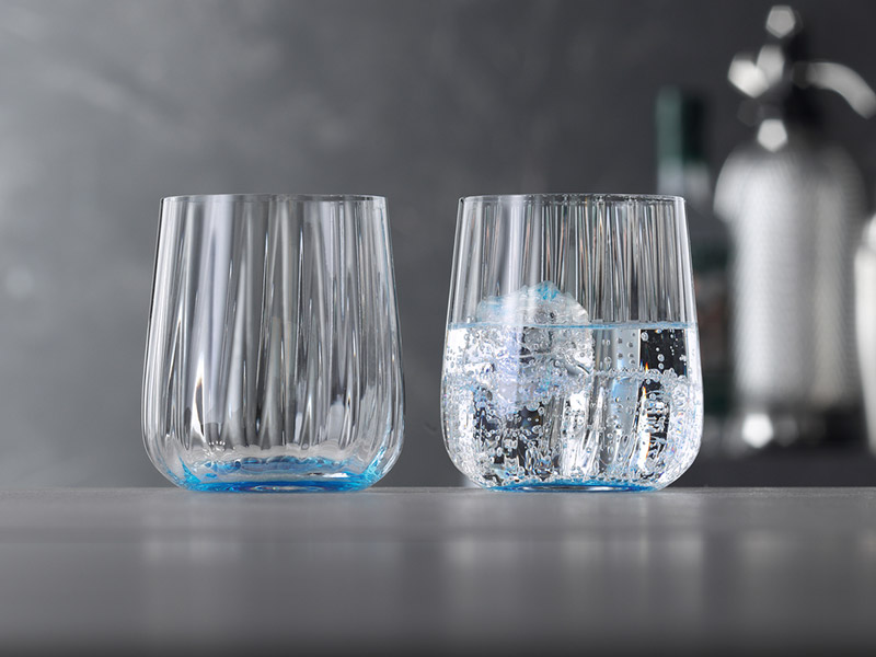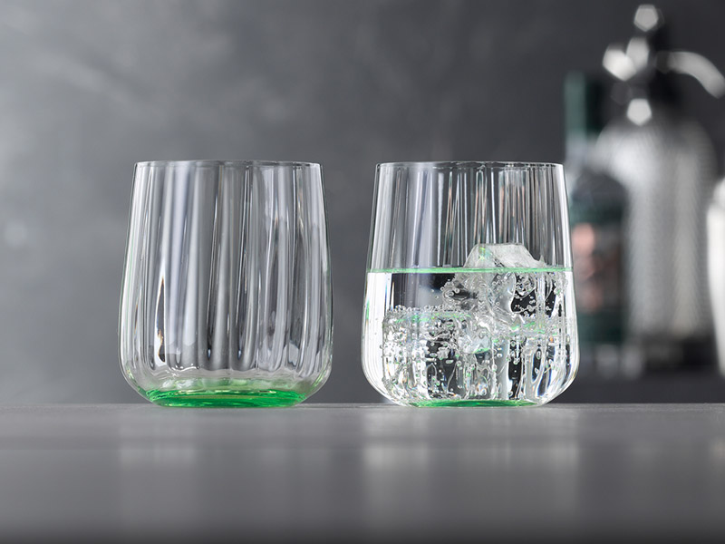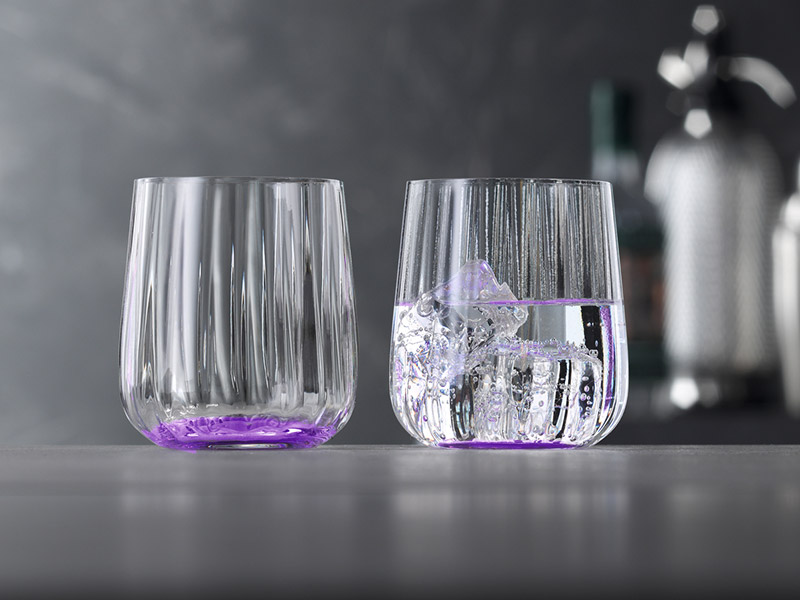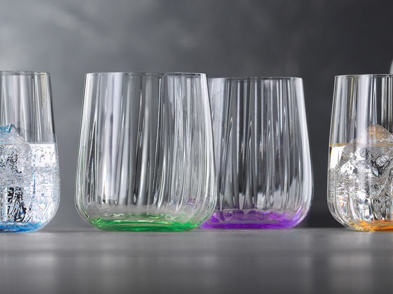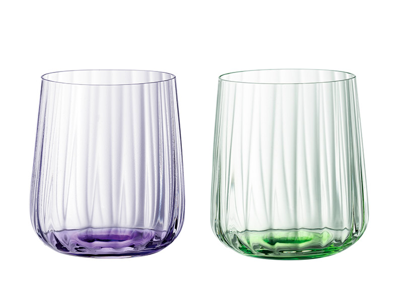 Los colores de esta gama de vasos se concentran en la base y se gradúan sutilmente hacia arriba a través del cristal. Disponible en tonos Ocean, Leaf, Sun y Lilac, la serie tiene un carácter único y distintivo creado por el fascinante juego de colores y las líneas verticales sopladas de los diseños.