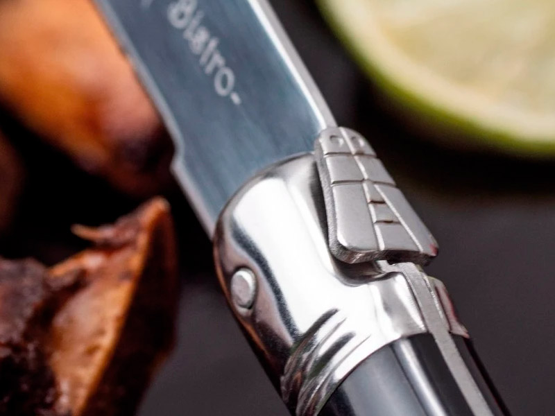 Hojas de Acero Inoxidable AISI 420 y mangos de madera de abedul con remaches en aluminio. Dos acabados: rojo o negro.<b> En caja de cartón de 6 unidades. Ya no van en caja de madera</b> No apto para lavado en lavaplatos.