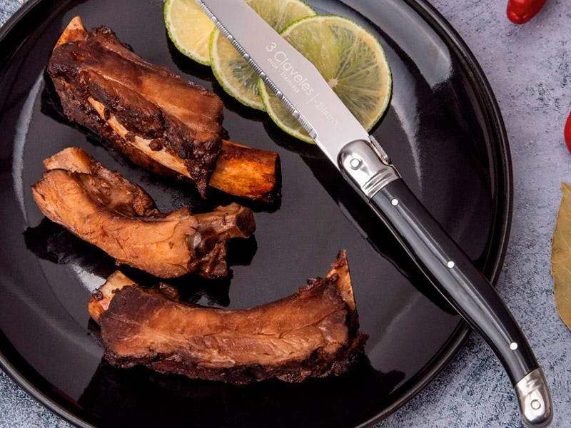 Cuchillo chuletero presentado en estuche con 4 unidades. Filo dentado, corte preciso y sin esfuerzo. Mango en madera de fresno. Hoja en acero inoxidable.