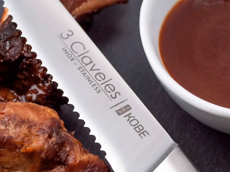 Set de 4 chuleteros Kobe. La elección ideal para disfrutar de carnes con el máximo sabor y comodidad. Forjado en acero inoxidable y con un filo dentado que garantiza un corte preciso y sin esfuerzo. Su mango de madera de castaño, ergonómico y elegante, aporta calidez y un acabado distinguido a la mesa.