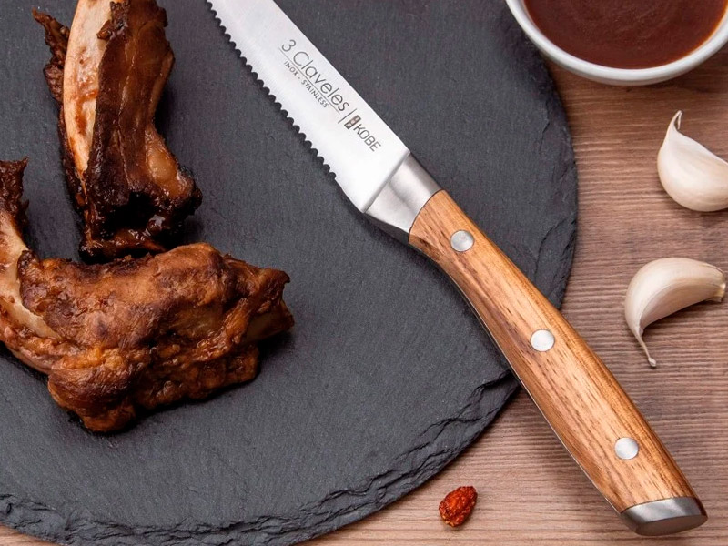Chuletero Nº 1 en ventas. Hojas Acero Inoxidable. Mangos de madera comprimida. Tenedor y cucharas a juego.