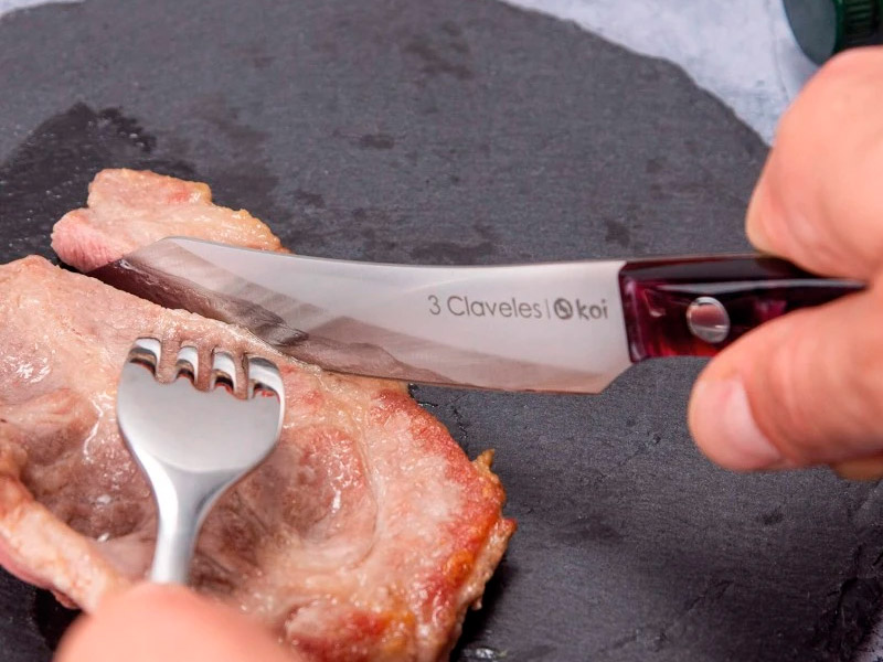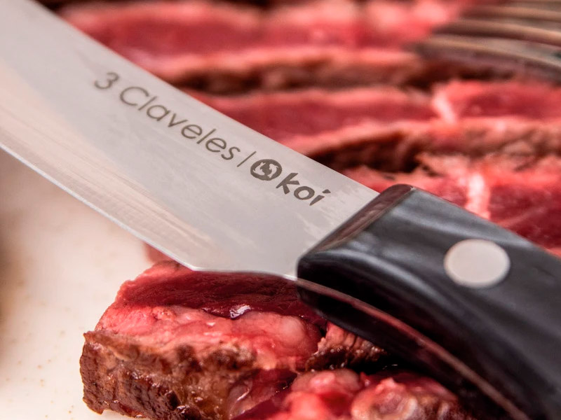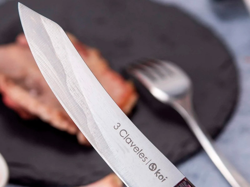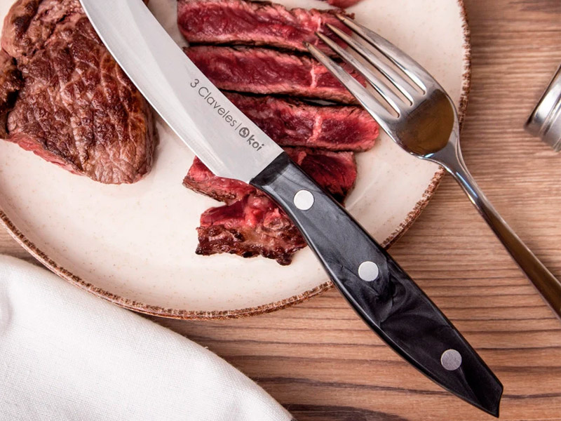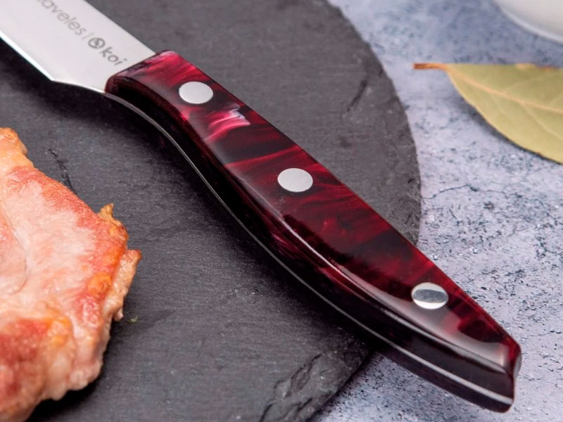 Set de 4 cuchillos cuchillos chuleteros Koi. Utensilio versátil y funcional, diseñado para disfrutar de carnes con un corte suave y preciso gracias a su filo liso en acero inoxidable Forjado en acero inoxidable y con un filo dentado que garantiza un corte preciso y sin esfuerzo. Su mango acrílico, marrón o negro, ofrece ligereza, resistencia y un tacto agradable