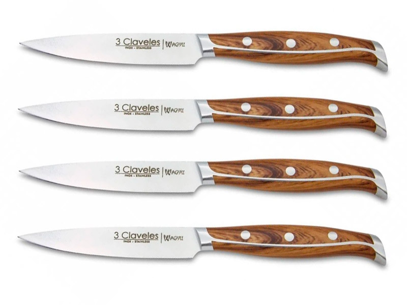Set de 4 cuchillos cuchillos chuleteros Wagyu. La elección ideal para disfrutar de carnes con el máximo sabor y comodidad. Forjado en acero inoxidable y con un filo dentado que garantiza un corte preciso y sin esfuerzo. Su mango de material ABS con acabado imitación madera combina la estética tradicional con la resistencia y facilidad de limpieza.