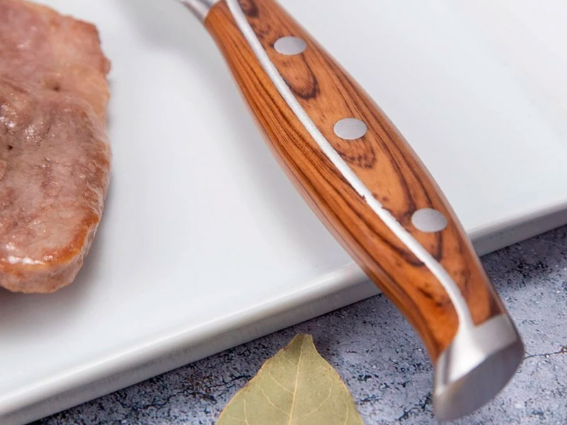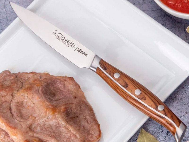 Chuletero Nº 1 en ventas. Hojas Acero Inoxidable. Mangos de madera comprimida. Tenedor y cucharas a juego.