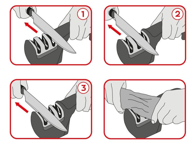 Con mango ergonómico. Paso 1: Barras con recubrimiento de diamante (Preparación del afilado); Paso 2: Placas de Carburo Tungsteno (Afilado grueso); Paso 3: Barras Cerámicas (Afilado fino).