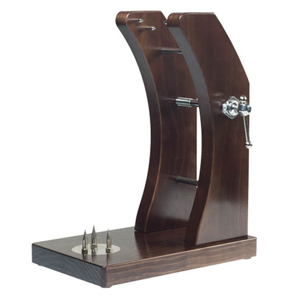 Jamonero fabricado con madera de pino insigne chileno de primera calidad. Los herrajes y los pinchos son de acero con el acabado de la superficie en cromo brillo. Con el sistema de sujeción mediante presión del torniquete, conseguimos un seguro y perfecto anclaje del jamón, su diseño nos permite un corte inclinado (45º) fácil y cómodo, ideal para espacios reducidos. Base con cuatro patas antideslizantes de silicona.