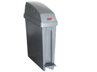 Papelera de higiene femenina. Forma estrecha adaptada al volumen del baño. Apertura higiénica con un pedal que evita el contacto directo. Zona de depósito hermética.