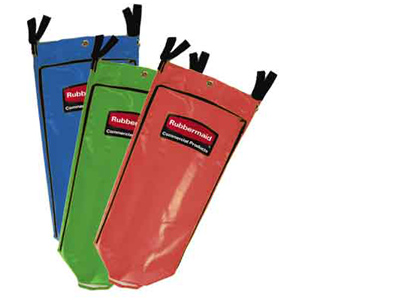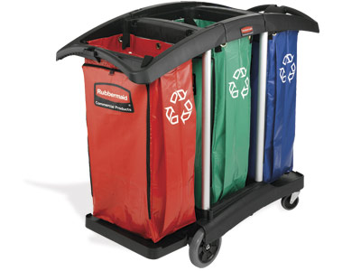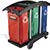 Carro de triple capacidad en aluminio y plástico inoxidable. Soportes para escobas en ambas asas ergonómicas. 2 ruedas giratorias y 2 fijas. Bolsas de vinilo forradas con PVC de 128 Litros con cremalleras.