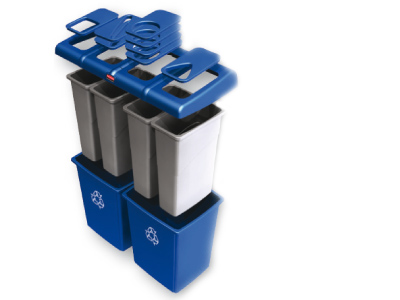 Estación de reciclaje de 348 L. Incluye 2 bases, 4 Slim Jim de 87 L, 7 tapas y pictogramas. Montaje sin herramientas. Medidas 134,6 x 61 x 90,2 cm.