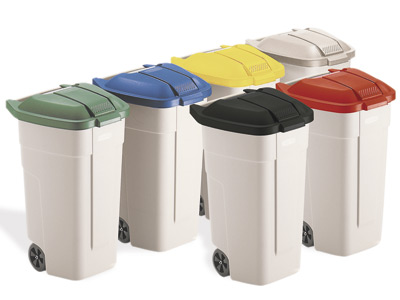 Contenedores de 100 L y hasta 75 Kg. Base de color beige y tapas de colores. Asas ergonómicas. 50 x 52 x 80 cm.