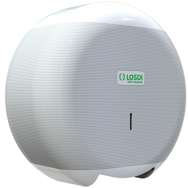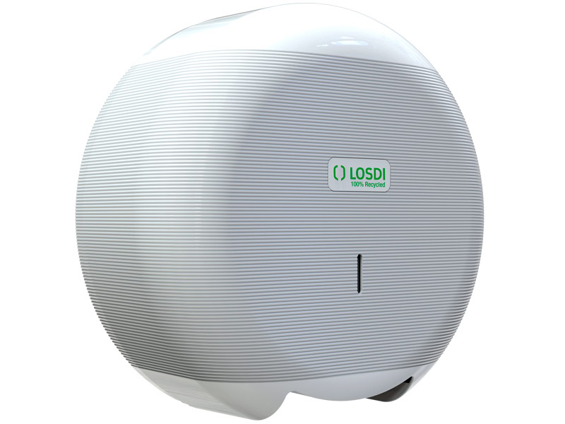 Dispensador de papel mecha Eco-Luxe. Dispensación controlada. Plástico 100% reciclado. Combina superficies lisas con zonas onduladas.