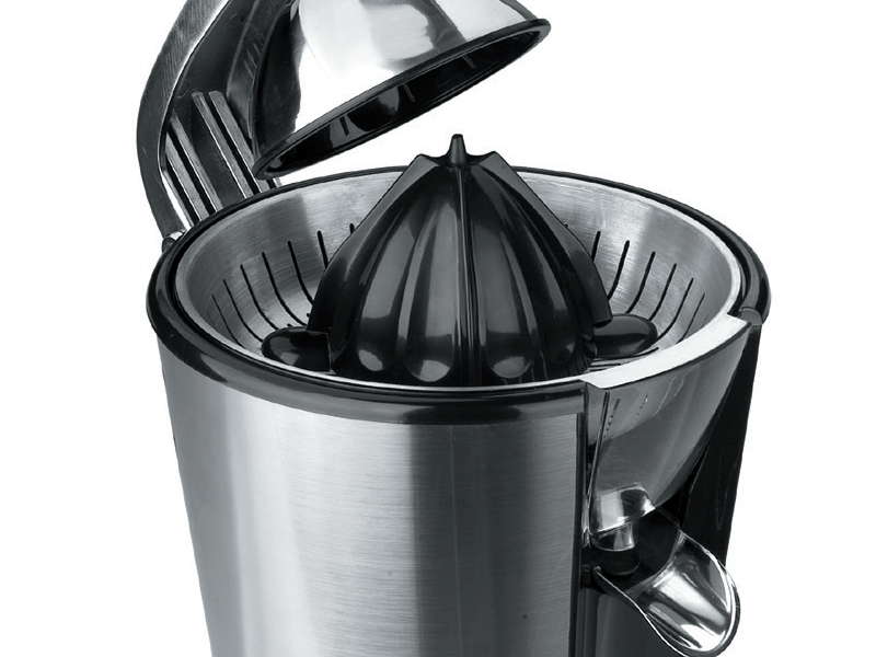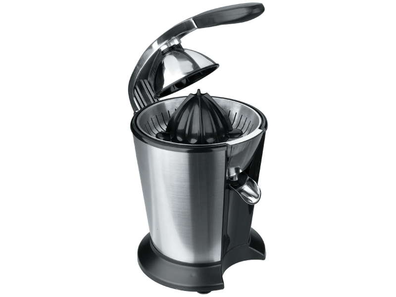 Modelo ECM manual. Potencia 130 W. Colador interior en acero inoxidable. Producción: 200 naranjas/hora. Velocidad 1.410 rpm.