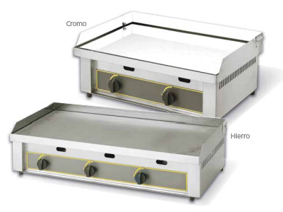 Gas. Hierro dulce o cromado de 10 mm. Cocción homogénea.1 a 3 quemadores en batería y mandos para regular la posición, con posición en espera.