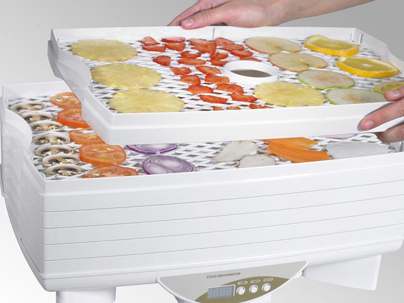 Deshidratador eléctrico a baja temperatura (preserva las vitaminas hidrosolubles, las enzimas, los fitonutrientes y los minerales). Incluye 5 bandejas de 33 cm de diámetro. 250 W.