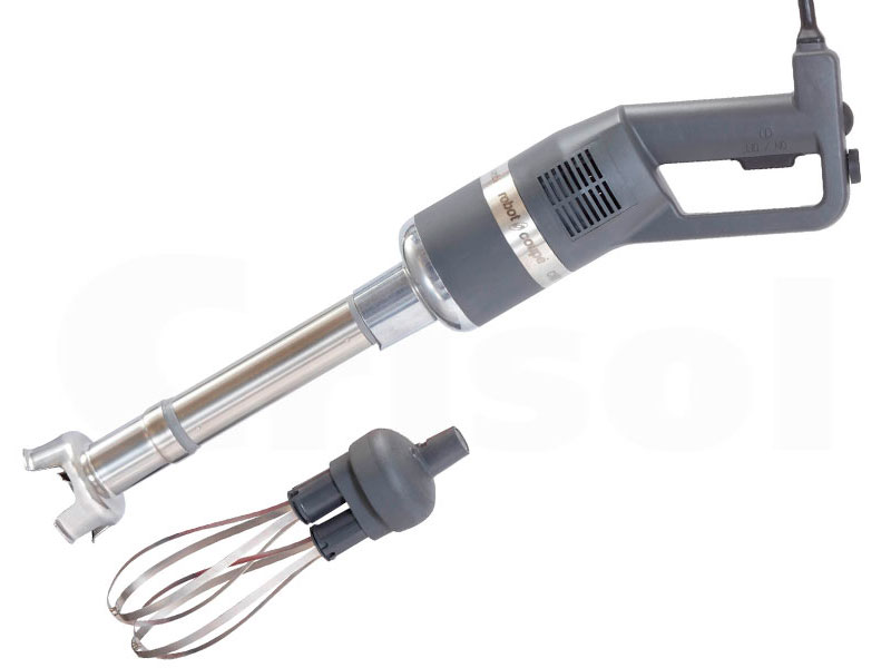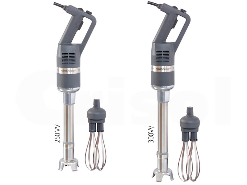 Grandes volúmenes. Bloque motor de acero inoxidable. Desmontables. Mangos ergonómicos. Batidor de acero inoxidable. Velocidad variable 1.500-9.000 rpm.