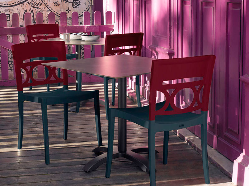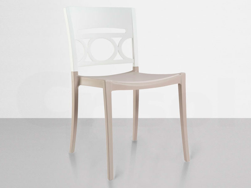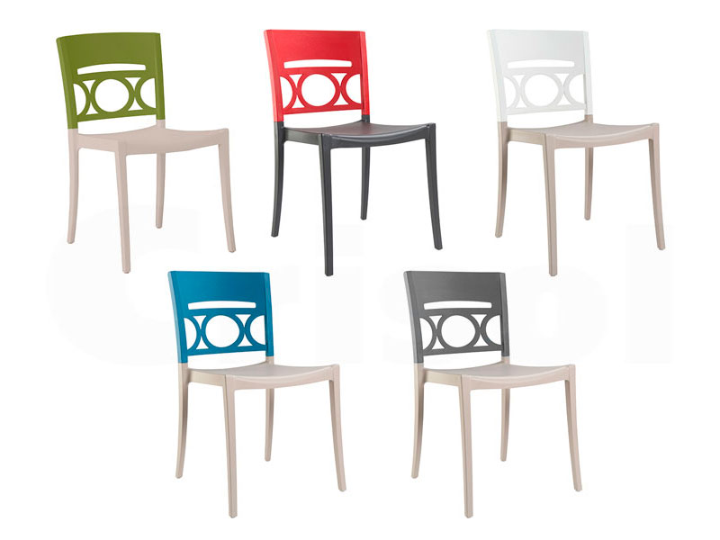 Silla de polipropileno reforzado con fibra de vidrio. Resistente rayos UV. Apilable. Altura: 82 cm. Anchura: 50 cm. Fondo: 49 cm.