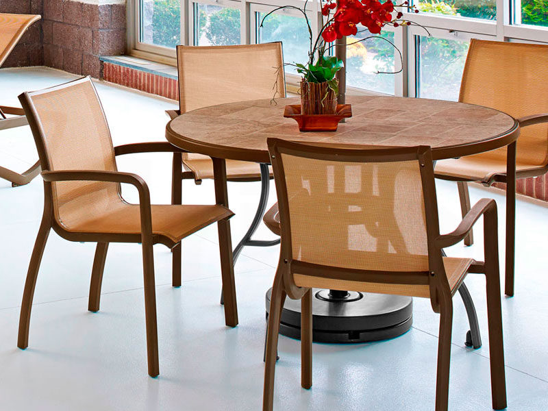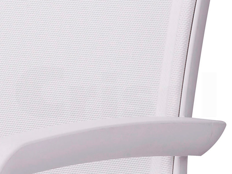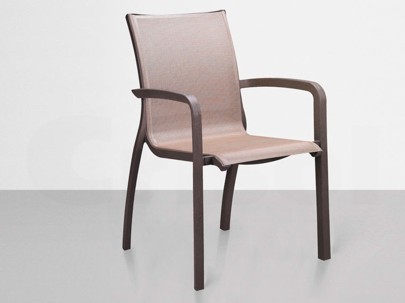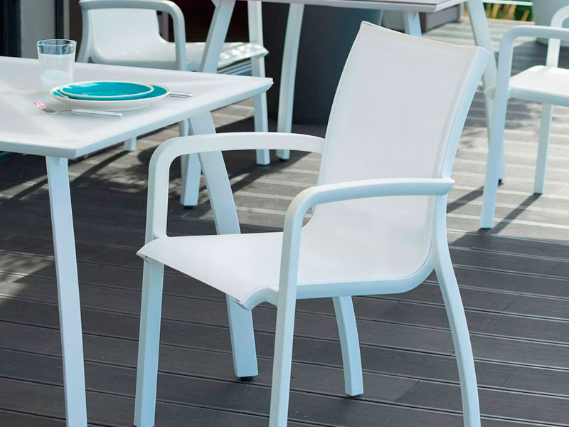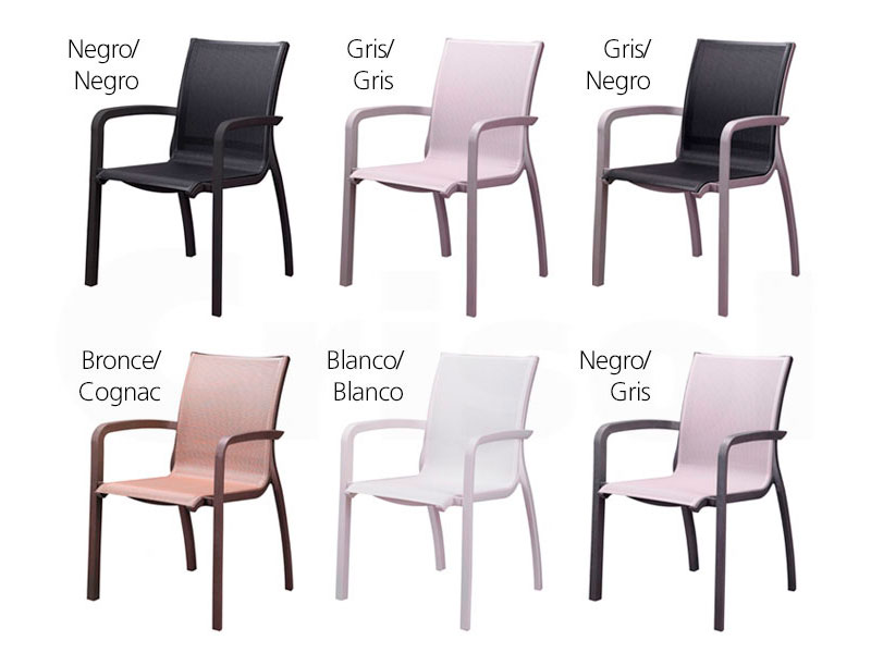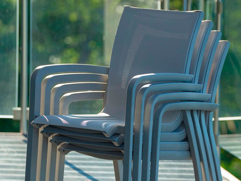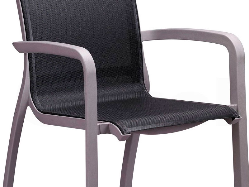 Sillón de polipropileno reforzado con fibra de vidrio y partículas de aluminio que le dan la impresión de ser de ese material. Asiento y respaldo de textilene indeformable y antibacterias. Resistente rayos UV. Apilable.