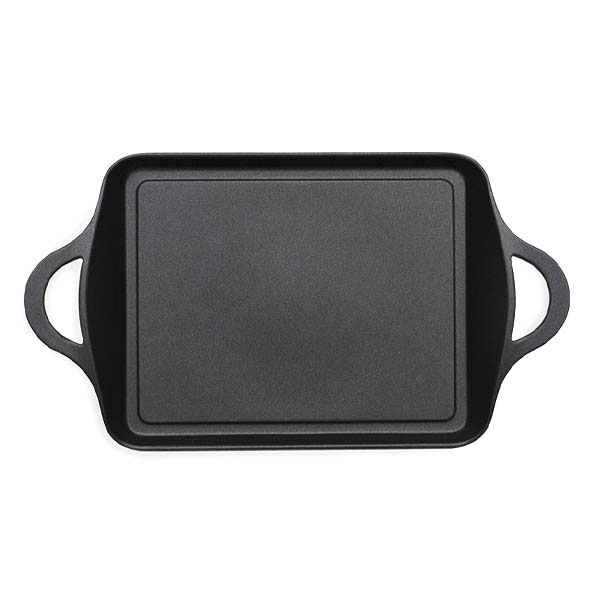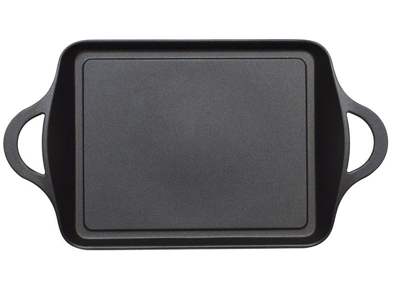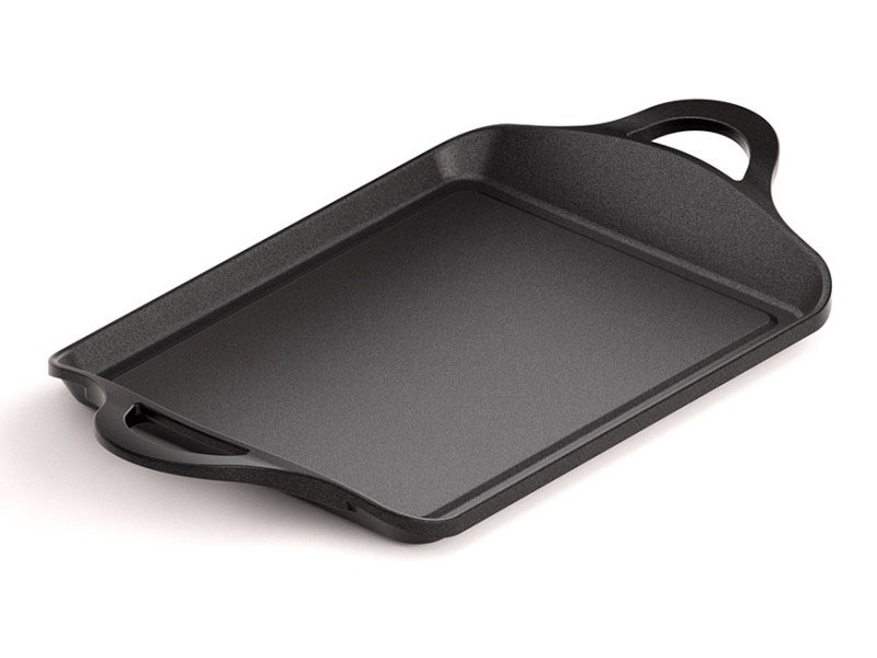 Parrilla plana Origen. Plancha hecha con aluminio fundido 100% reciclado indeformable y duradero. Apta para todas las fuentes de calor, incluido inducción. Antiadherente multicapa reforzado con partículas de titanio, libre de PFOA y resistente hasta 260ºC. Asas de aluminio fundido, aptas para el horno. Fondo grueso de 6mm de espesor que permite una repartición del calor homogénea y rápida.