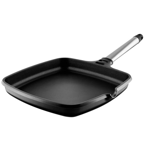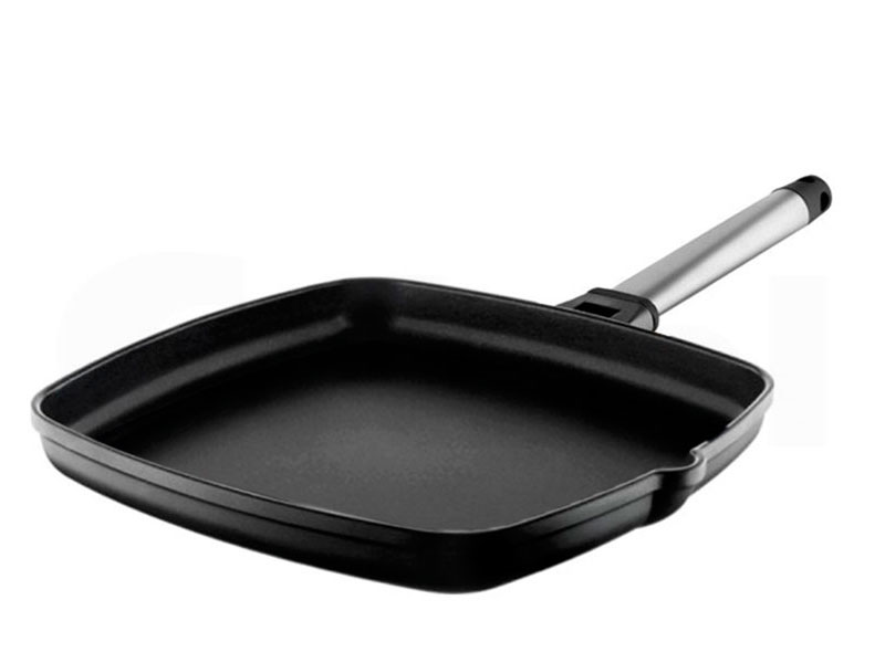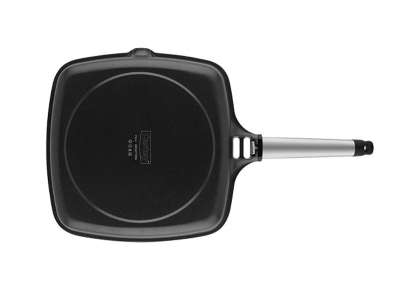 Asador Induction. Aluminio fundido de gran espesor. Distribución homogénea del calor. Indeformable. Mango en acero inoxidable desmontable. Ideal para cocinar sin grasas. Resistente al horno hasta 250ºC (sin el mango).