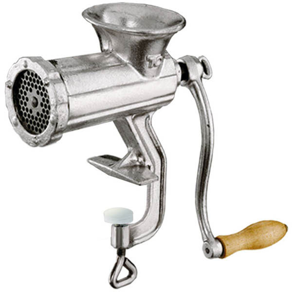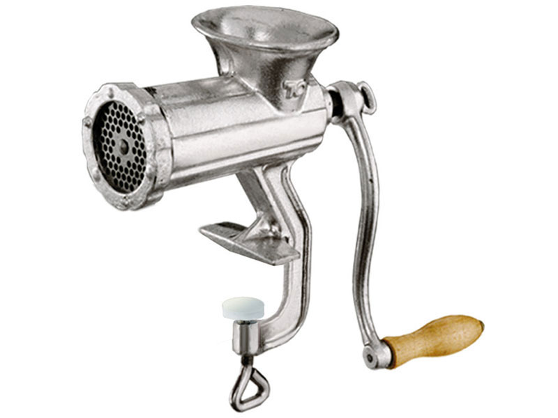 Picadora de carne manual. Fabricada en hierro fundido estañado. Una vez insertadas las piezas de carne en la picadora y fijada la manivela (recubierta de madera para un agarre cómodo) en el eje del tornillo sinfín, solo tienes que girarla para moler tu carne. Muy estable gracias a su fijación con brida.