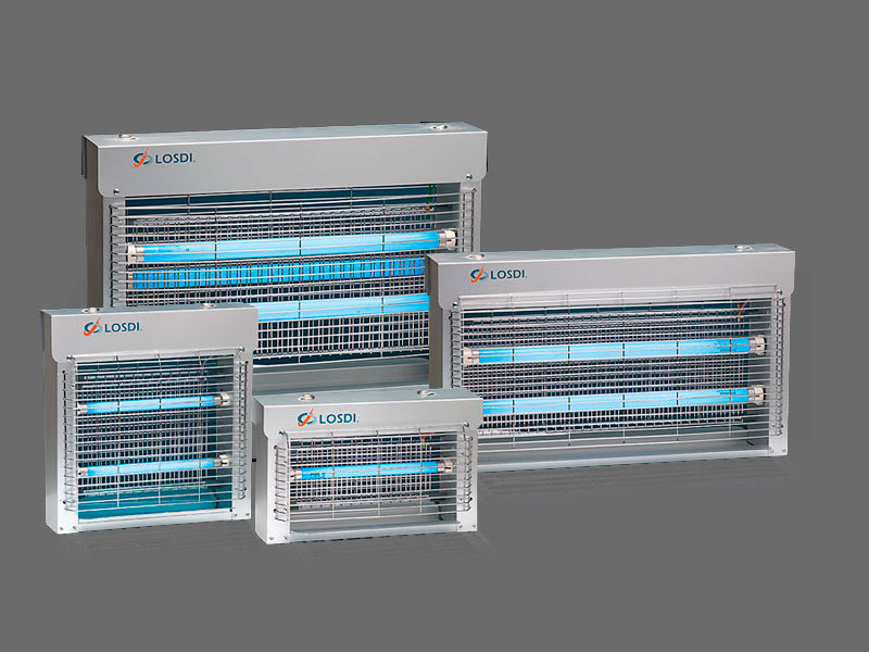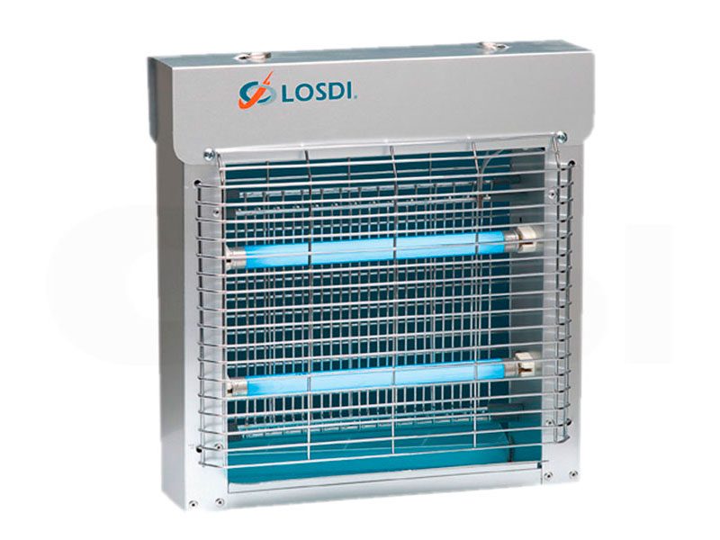 Matainsectos electrónico de parrilla. Tensión de la rejilla 2.500 V (5.000 V en el mod. 3x15W). Construcción en Acero Inoxidable. Con interruptor y descarga automática de tensión.