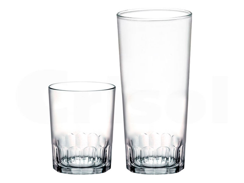 30 cl Ø75mm Alt. 91 mm. Policarbonato transparente, aspecto cristal. Ideal para bares de playa o piscina.