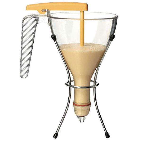 Embudo de 1,5L. Ø20 cm, altura 34 cm. Mango ergonómico de plástico con 3 boquillas (2, 4 y 6mm). Incluido pie de alambre y bandeja recogegotas.