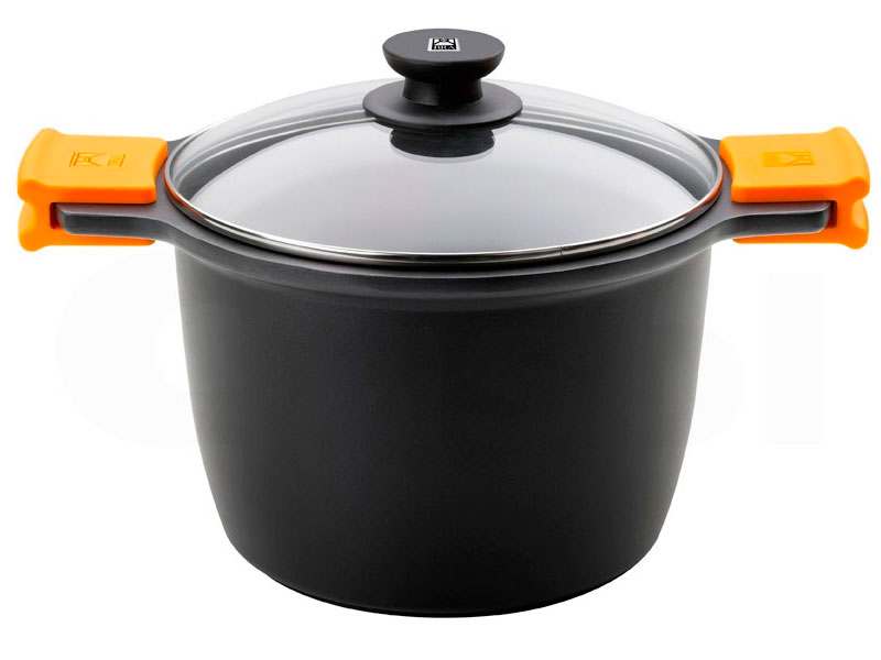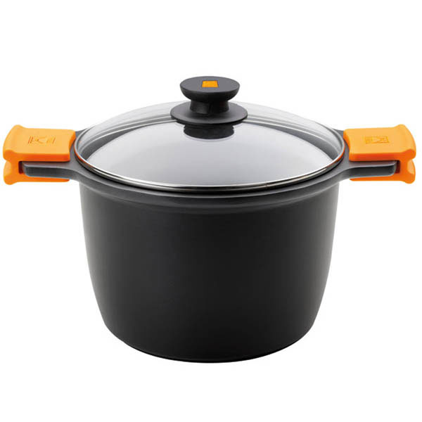 Olla alta Efficient con tapa y protectores de asas de silicona. Fabricado en aluminio fundido indeformable de 6 mm de espesor, con un fondo difusor de dos capas de acero inoxidable. Recubrimiento interior antiaderente Teflon Platinum Plus y protección antiadherente en todo el exterior para una limpieza más fácil y perfecta.