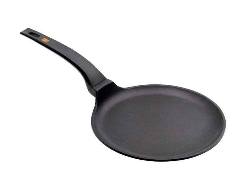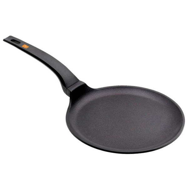 Crepera Efficient. Fabricado en aluminio fundido indeformable de 6 mm de espesor, con un fondo difusor de dos capas de acero inoxidable. Recubrimiento interior antiaderente Teflon Platinum Plus y protección antiadherente en todo el exterior para una limpieza más fácil y perfecta.