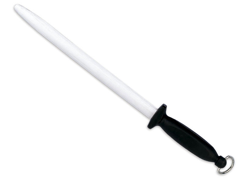Esta chaira de acero es capaz de minimizar las deformaciones formadas en la superficie de la hoja del cuchillo. Es una herramiento imprescindible para mantener el filo en perfecto estado. La forma ergonómica del mango de polipropileno hace que se ajuste perfectamente a la mano, aumentando la precisión de los movimientos. Al final del mango hay un anillo metálico que permite colgar cómodamente el afilador cuando no se use.