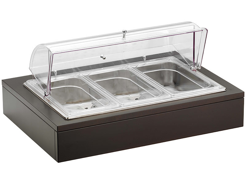 Compuesto por: 1 recipiente baño maría GN 1/1 h 110, 3 cubetas policarbonato GN 1/3 h 100 mm, 1 doble fondo perforado GN 1/1, 2 packs de gel refrigerante 20 x 19 cm, 1 campana rectangular abatible de policarbonato, 1 base baja MDF acabado Wengué.