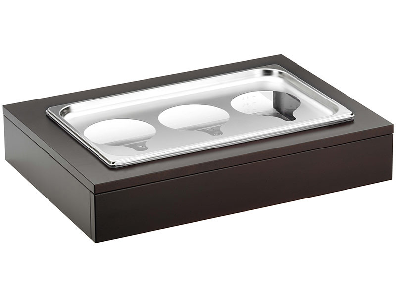 Compuesto por: 1 bandeja perforada para jarras, 1 cubeta policarbonato GN 1/1, 3 jarras de vidrio de 1,5 L., 1 falso fondo perforado de policarbonato, 2 packs de gel refrigerante 20 x 19 cm, 1 base baja MDF acabado Wengué.