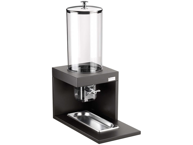 Compuesto por: 1 dispensador para cereales de diámetro 18 cm y 8 litros de capacidad con tapa, 1 cubeta GN 2/8 h 20 mm, 1 estructura en MDF Wengué para dispensador de cereales. Medidas 25 x 46 x altura 66 cm.
