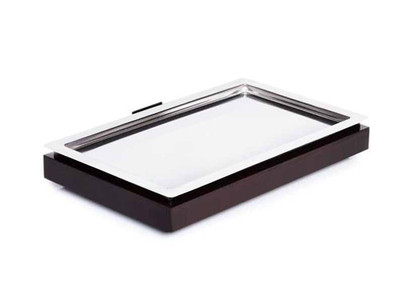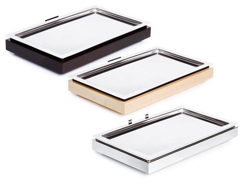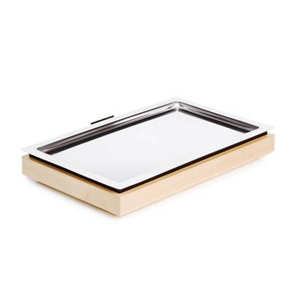 Expositor Buffet Frames. Incluye el marco en 3 diferentes acabados (acero Inoxidable 18/10, wengué o arce), el acumulador de frío, una bandeja GN 1/1 de poliestireno y una bandeja GN 1/1 Inox.