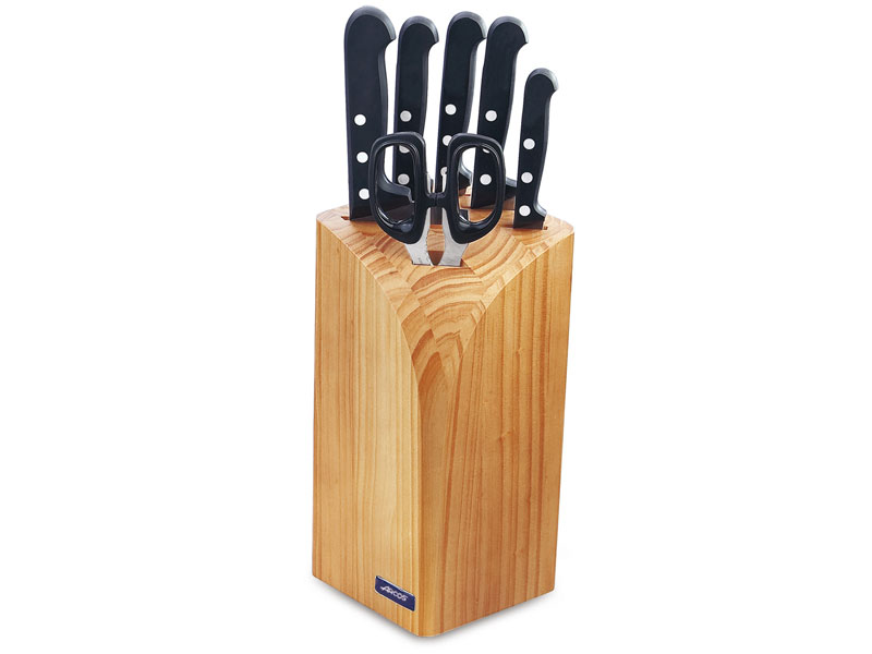 Taco de madera: Bloque de Madera de Pino. Cuando no vayamos a utilizar los cuchillos debemos guardarlos en un lugar seguro. siempre fuera del alcance de los niños.Un taco de cocina sería el sitio idóneo. evita accidentes y la hoja el cuchillo queda perfectamente protegida.
